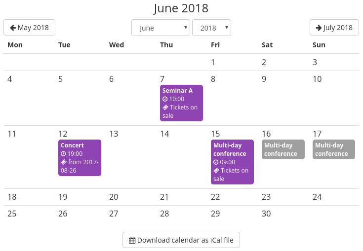 On an organizer's public profile page, the events can now optionally be shown as a calendar instead of a list. This is especially useful if you have lots of events. Additionally, the events of an organizer are now exposed as an iCal feed that people can subscribe to or add to their personal calendars.