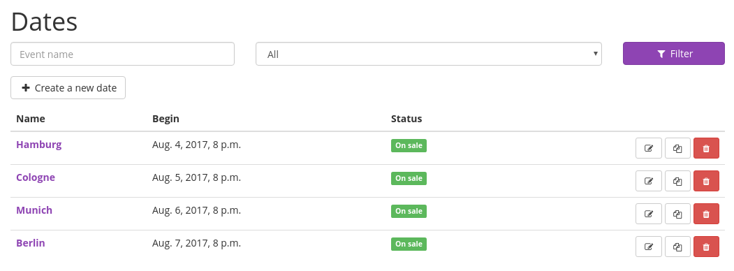 Events can no longer only represent a single event, but also a whole event series. By this we mean a collection of events that share most of their properties and should be handled in a single ticket shop. We imagine this feature being very useful for example for theater groups who play the same piece multiple times or a band on tour or for training offers or seminars that have multiple possible dates.