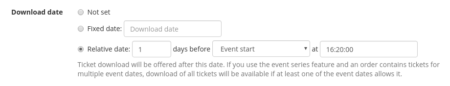 In many settings, you can now specify dates relative to the event date or relative to the end of presale etc. instead of with an absolute date. This comes especially handy if you use the event series feature described above, since a fixed date might not do the job any more.