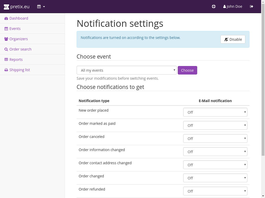The largest change in pretix itself is the new possibility to get notified whenever something happens in your event. If you have an event that only sells a few tickets per week or month, it is cumbersome to have to open pretix regularly just to have the lastest numers or to react to ticket orders.