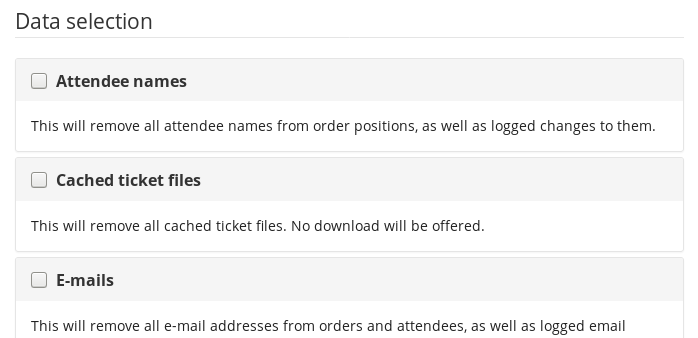 pretix does not allow to delete orders once they've been created, and this is on purpose, since pretix is supposed to be audit-proof when it comes to payments and accounting. However, many of you have been asking for a way to avoid keeping personal data of your customers on the server forever, and for a few years had the vision of a "data cleaner" tool that we never got around to build. Now, we finally built it and it is here to use.