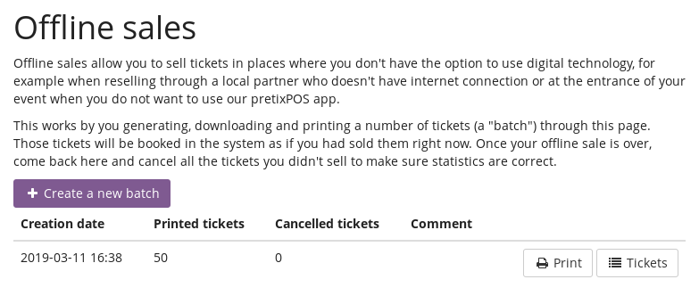 With our new plugin Offline sales, pretix got you covered in these situations as well. Just create a bunch of tickets in advance through the backend, print them, sell them, and cancel the ones you didn't sell. Easy!