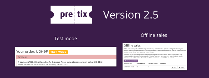 Today, we are releasing the next monthly release of pretix. pretix 2.5 includes a much-anticipated test mode and lots more. Big thanks go out to Alexander Schwartz, Alvaro Enrique Ruano, arabestia, oocf, Maarten van den Berg, Maximilian Hils, and 徐志能 who contributed to this release. ❤️