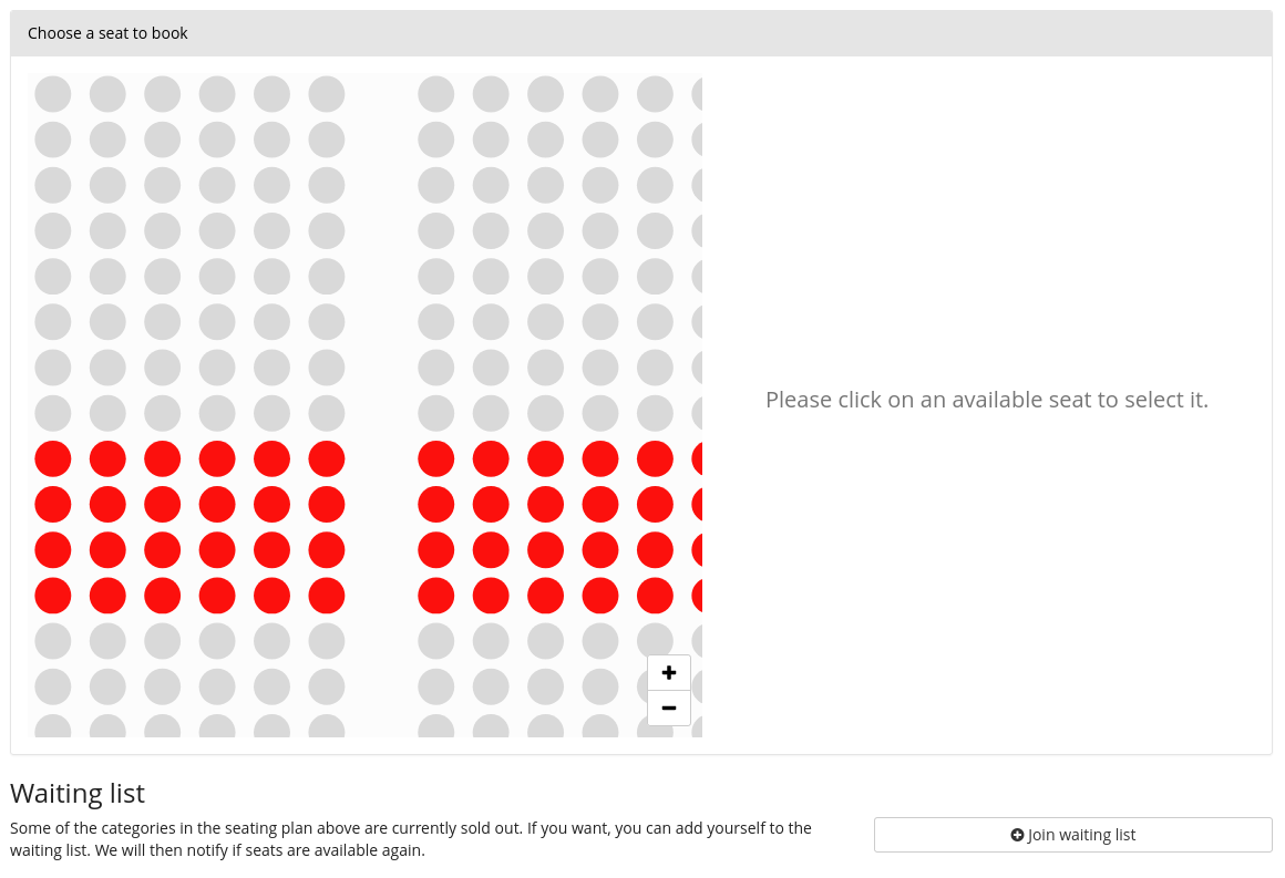 There is now limited support for seated events. In a seated event, the waiting list will now show up and work properly if a category of seats is sold out. We consider this support to be limited because it is still primarily based on quota calculations, i.e. if you have more quota than you have seats, the waiting list will not work properly. While we've put in some safeguards to prevent the most obvious problems, as soon as you have fewer seats available than quota available you can run into situations where the waiting list won't show up – or where people on the waiting list will be notified that they can buy a ticket but all seats might be gone by the time they click their link. Especially, the waiting list should not be used in combinatiton with the minimum distance feature.