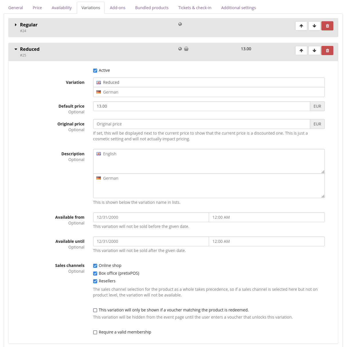This is useful in many cases and allows for a cleaner product structure. If you e.g. want to have an early-bird price of a ticket that is otherwise identical, you can now use a variation and thus reduce the number of products you need. Most importantly, though, this finally allows some of our most powerful pricing features such as early-bird pricing or special pricing for invited guests to be used in combination with a seating plan where every seat needs to map to just one product.
