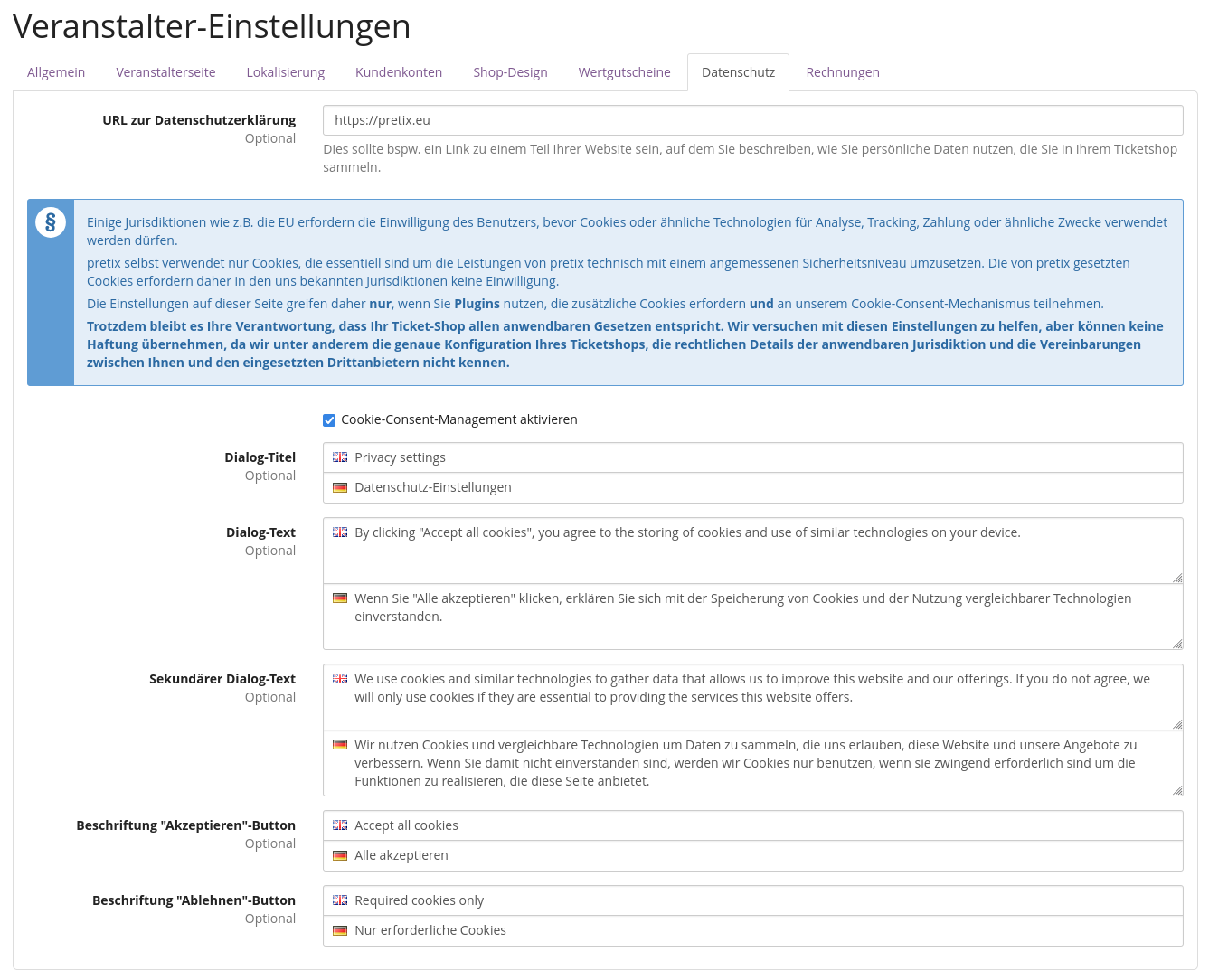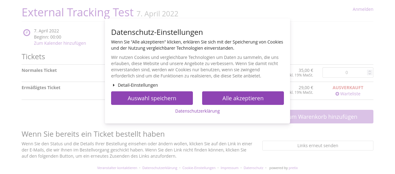Es gibt jedoch Anwendungsfälle, in denen ein Cookie-Banner notwendig ist. Beispielsweise können mit dem pretix-Plugin Externes Tracking externe Dienste wie Google Analytics eingebunden werden. Bisher gab es hier (nur auf pretix Hosted) einen Mechanismus, der in diesem Fall automatisch einen dezenten Cookie-Banner eingeblendet hat und Nutzern die Möglichkeit gegeben hat, dem Tracking nachträglich zu widersprechen (Opt-Out). Dies ist nach der neuen Regelung nicht mehr zulässig.
