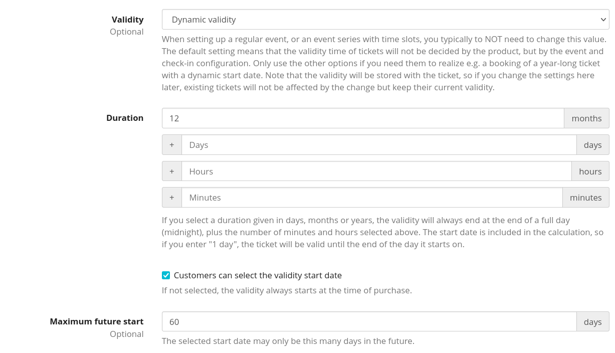 With this release, we add the option of explicit ticket validity that is fixed for a specific ticket based at the time of ticket creation. This is useful if your setup is less event-based and more of an ongoing operation. For example, you can now offer a year pass that allows access to your venue for a full year, starting at a start date that can be defined individually by the customer: