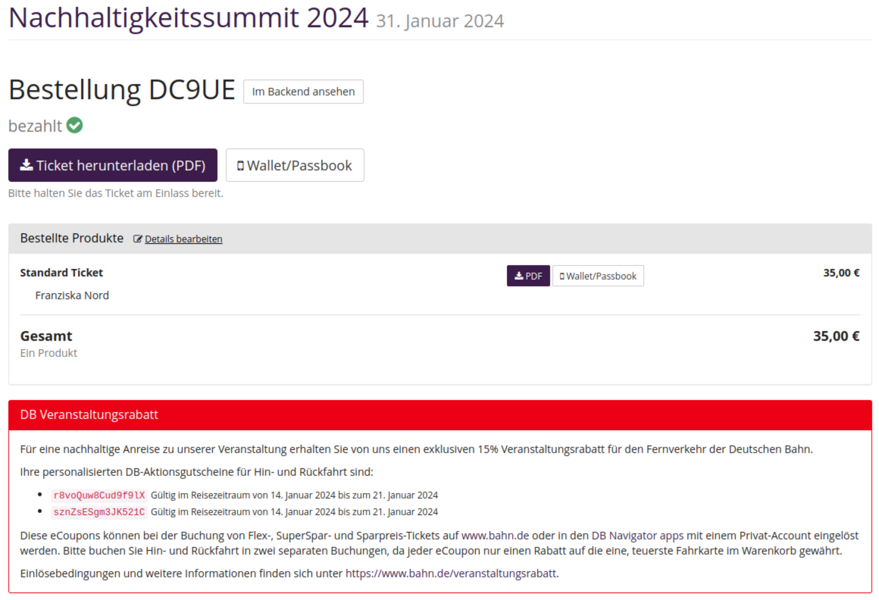 Als nachhaltiges Unternehmen freuen wir uns sehr, die Funktionalität des DB Veranstaltungsrabattes für alle pretix-Nutzende kostenfrei bereitstellen zu können.