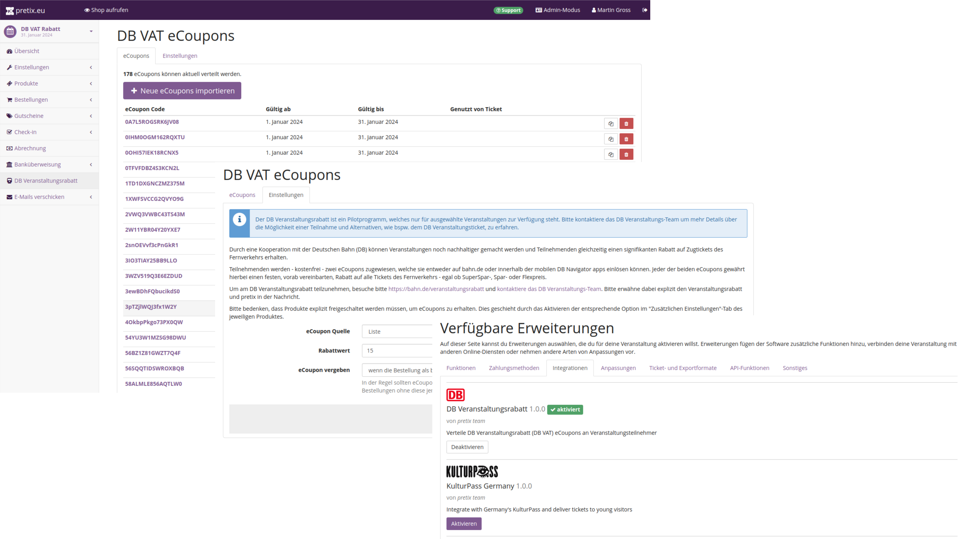 Veranstaltende die pretix für ihre MICE-Events nutzen haben es hier besonders leicht: Einfach die Erweiterung DB Veranstaltungsrabatt aktivieren, die von der DB bereitgestellten Aktionsgutscheine hinterlegen und die Produkte auswählen, die einen Aktionsgutschein erhalten sollen.