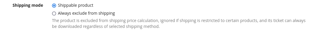 When using the Shipping module, you can now declare products to be entirely excluded from the shipping logic. An excluded product will not be counted for shipping fees, will not control which shipping methods are available and will not be prevented from downloading the ticket in PDF form. An order consisting only of excluded products will not require selecting a shipping method. This allows better handling of use cases where a shop mixes actual tickets that should always be sent digitally with physical products that may be shipped.