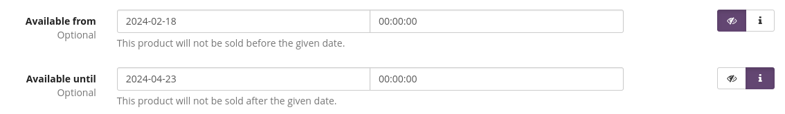 When setting a product to be available only within a certain time frame, you can now select whether the product should stay hidden before or after this time frame (the previous behavior), or if the product should be shown with a message claiming that it is unavailable. This allows you to e.g. highlight how much a customer could have saved by using an early bird option or what tickets will become available later on.