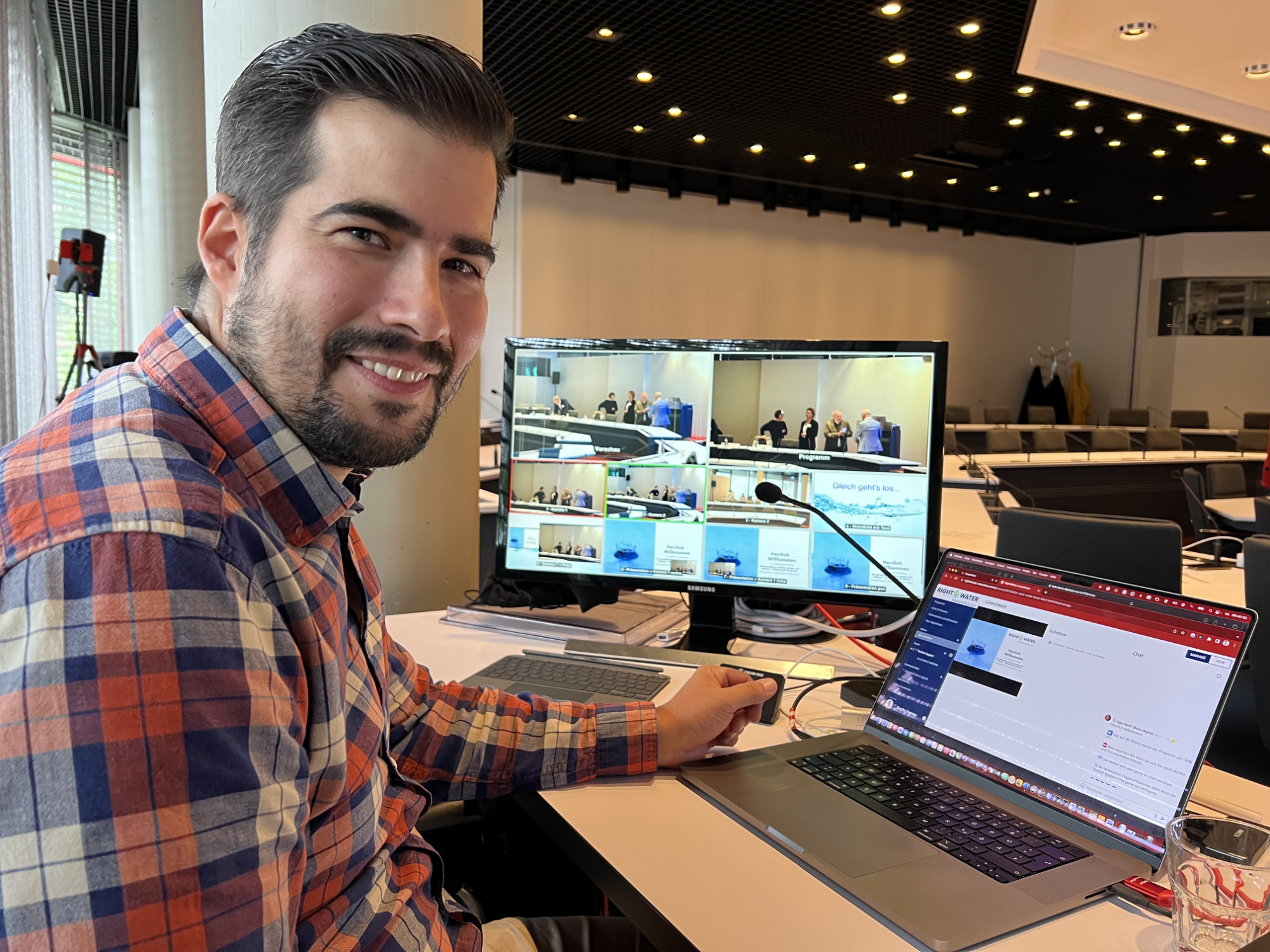 Sascha: „‘Digital first’ heißt für uns, dass wir hybride Events zuerst als digitale Events denken und erst danach nach ‚Hardware‘-Lösungen schauen, wenn wir keine schlanke digitale Lösung für ein Problem gefunden haben. Nur ein Beispiel: bei Livestreams arbeiten wir lieber mit dem netzwerkbasierten NDI-Protokoll als mit dicken HDMI- und SDI-Kabeln. Wir sind eher diejenigen, die mit dem iPhone filmen als schwere Kameras mit dem 7,5-Tonnen-Lkw anzufahren. Für uns heißt digital einfach ‚besser’.“