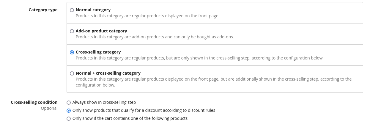 Similar to add-ons, cross-selling is configured through our ticket categories. You can set a ticket category to be shown exclusively in the cross-selling step, or both in the cross-selling step and the regular product list. Additionally, you can constrain the visibility to carts with specific contents or to carts where an automated discount rule applies but the discount has not yet been used.