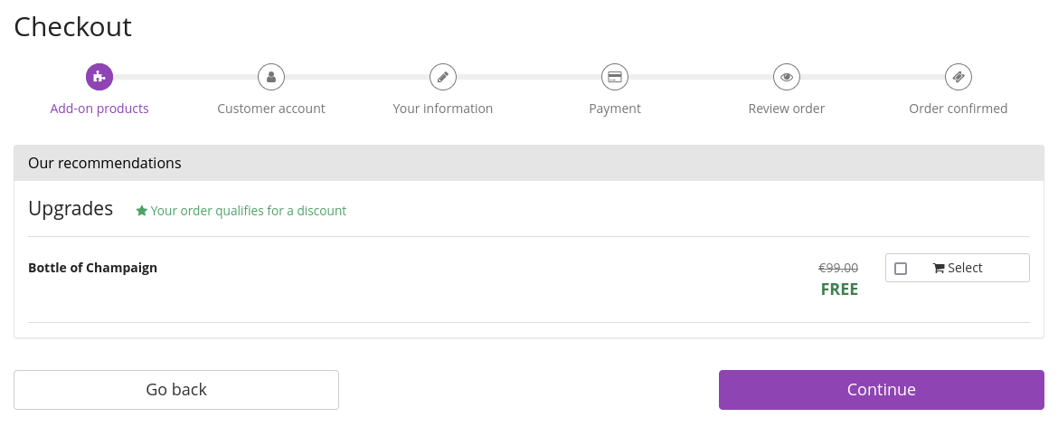 During checkout, the option to make use of a discount offer should be highlighted. For example, a dinner event might offer a free welcome bottle of champaign for everyone who purchases at least 5 tickets. With a combination of our automated discount rules and the new cross-selling feature, you can make this offer visible in the checkout process and make it easy for your customers to use the discount. This example is shown in the screenshot below.