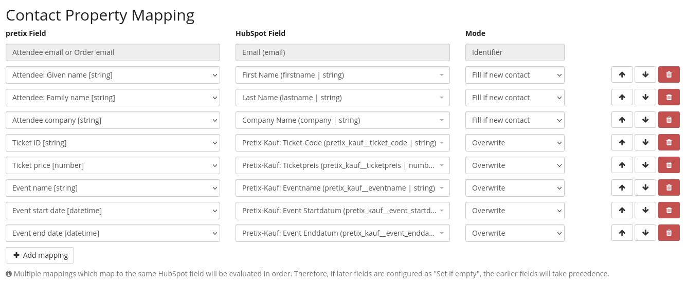 Specifically, the plugin is able to create or update a contact in HubSpot for every attendee registered in pretix. The mapping of pretix fields to HubSpot fields (as well as the policy of whether a field should be overwritten on the HubSpot contact or only be set if it is not previously known) is fully configurable in our pretix backend: