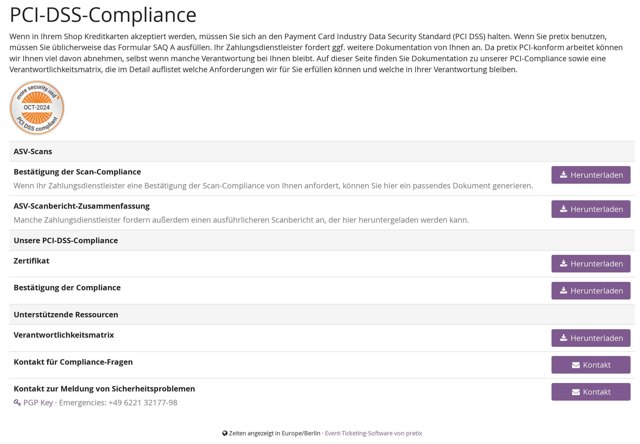 - Die Bestätigung der Scan-Compliance des sogenannten ASV-Scans ("Approved Scanning Vendor": Ein externer, zugelassener Dienstleister für Netzwerk-Scans nach PCI-DSS). Dieser Scan wird quartalsweise durchgeführt und der Bericht individuell für Ihr Veranstalterkonto zusammengestellt und an dieser Stelle für Sie zum Download angeboten.