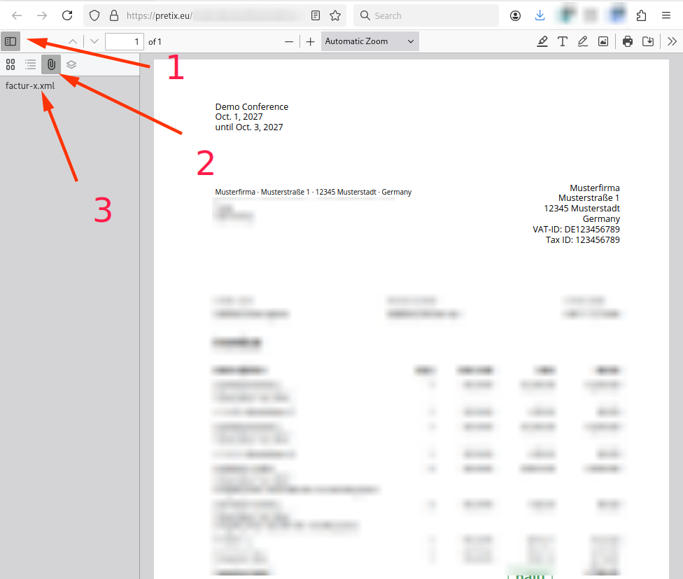 Wenn alles eingerichtet ist, stellt pretix E-Rechnungen aus. Diese sehen auf den ersten Blick genauso aus wie zuvor, enthalten aber einen Anhang. Dieser kann in vielen PDF-Anzeigeprogrammen in der Seitenleiste gefunden werden, hier im Beispiel für die Anzeige in Mozilla Firefox: