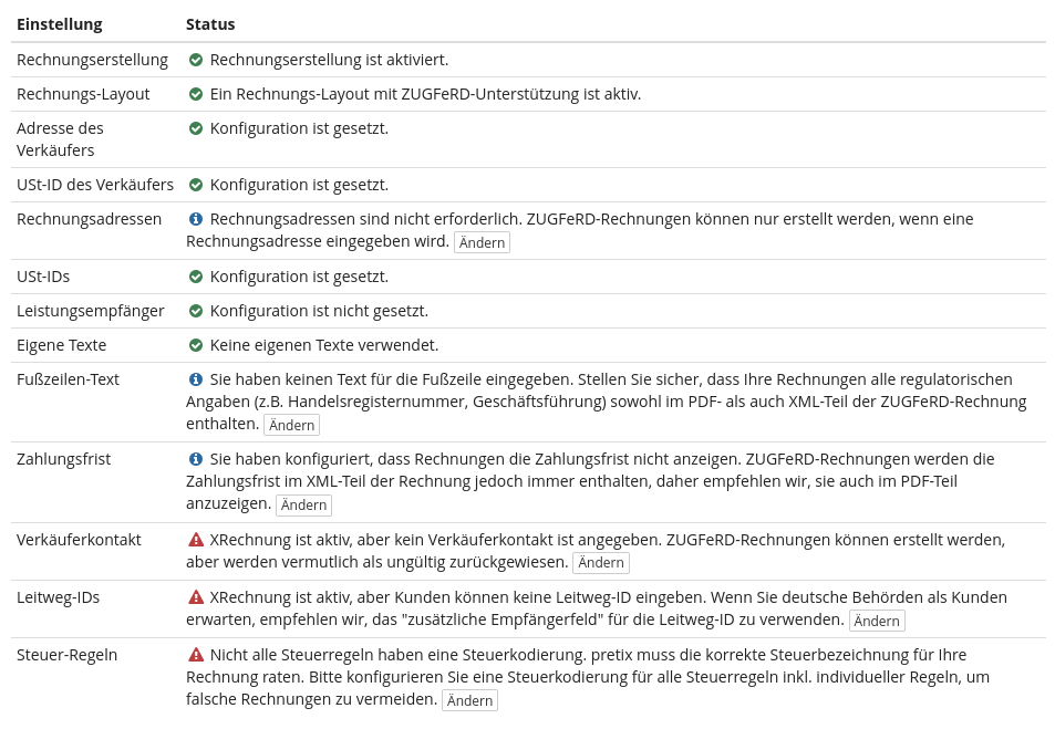 Danach können Sie in Ihrer Veranstaltung das neue Menü Einstellungen → ZUGFeRD aufrufen. Hier erhalten Sie weitere Tipps und Hinweise zur korrekten Konfiguration Ihrer Veranstaltung für die Erzeugung gültiger E-Rechnungen. Sollten noch Fehler identifiziert werden, führt das System Sie direkt zur entsprechenden Option: