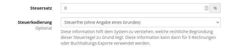 Daher haben wir in pretix nun die Möglichkeit geschaffen, einer Steuer-Regel eine sogenannte "Steuerkodierung" mit dem Grund für die Steuer hinzuzufügen. Wir empfehlen, in allen Steuer-Regeln diese Begründung auszufüllen. Für steuerbefreite Veranstalter*innen, die E-Rechnungen ausstellen wollen, ist es empfehlenswert, aus diesem Grund ebenfalls Steuer-Regeln mit einem Satz von 0% und einem entsprechenden Grund anzulegen.