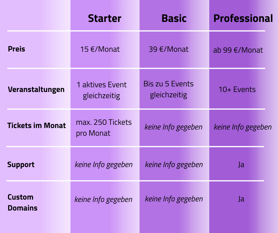 Zum einen könnt ihr pretix selbst hosten. Dafür haben wir vier verschiedene Kategorien: Community, Enterprise Starter, Enterprise Professional, und Enterprise Ultimate. Während Community kostenlos selbst gehostet werde kann, starten die Preise von pretix Enterprise bei 499 € jährlich, nicht bei 15 € monatlich. Auch die anderen Preise, die von der KI angegeben wurden, stimmen natürlich nicht.