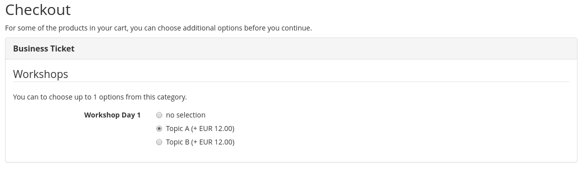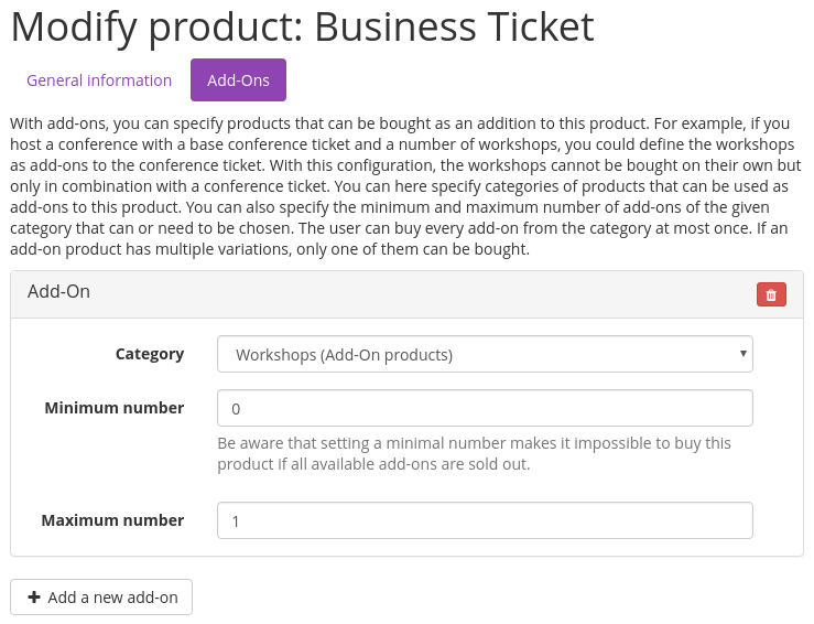 The big new feature in 1.3.0 are add-on products. Add-on products allow you to define products that your customers can buy in addition to a base product. A common example would be if you have a conference ticket as your base product and a number of optional, additional workshops that can only be bought together with a conference ticket. Using add-on products for this usecase help you to associate participants with their booked workshops in case of group orders.