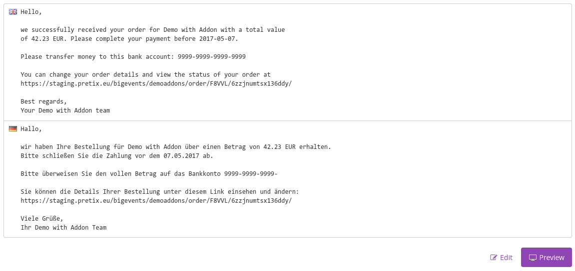 When editing the texts of emails in the event settings, there is now a "Preview" button that allows you to check if the email looks okay with values filled in for the placeholders. Additionally, it is no longer possible to save an email text containing invalid placeholders.