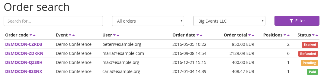 We added a new navigation item to the global menu that might be really helpful if you run lots of events and people call you with a question on their order: The new feature allows you to search for an order across all events you have access to. You can search by name, email address, company and filter the results by organizer of the event and order status.