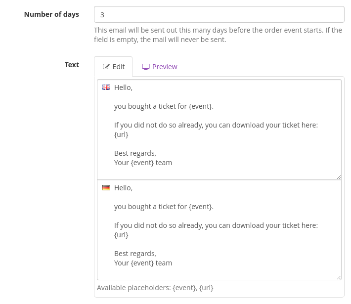 It is now possible to configure an email that will automatically sent a few days before your event to remind everyone to download their ticket. This is disabled by default, but might come very useful since you probably will have other things in your mind a few days before the event. Just configure it now and forget about it!