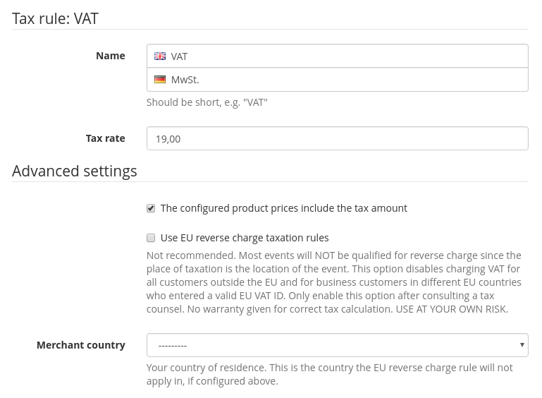 Additionally, you can configure a tax rule to implement the rules of EU reverse charge taxation if that is applicable to your event. Since this is an advanced feature, we recommend reading the new chapter of our User Guide first.