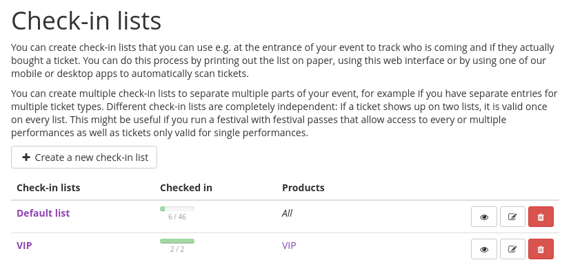 As a more advanced use case, suppose you have a music festival that consists of three concerts. You sell tickets for each one of them, but you also sell festival passes that allow access to all three of them. You could now create three check-in lists, one for each concert. They all include the ticket types for the respective concert as well as the festival passes.