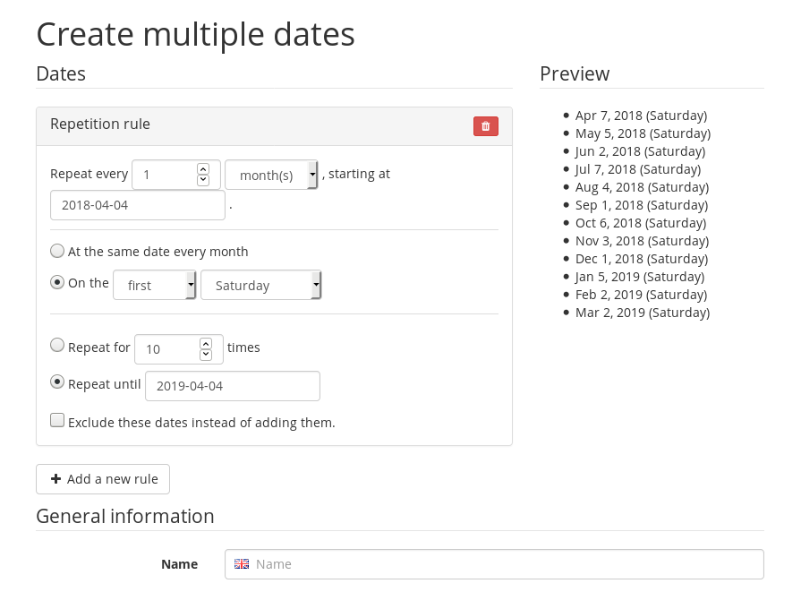 No matter if your event is every other day, every week on Tuesday and Thursday, or monthly on the first Saturday of the month – we've got you covered. With our simple interface, you can create events using powerful repetition rules, right next to a live preview of the dates that will be generated: