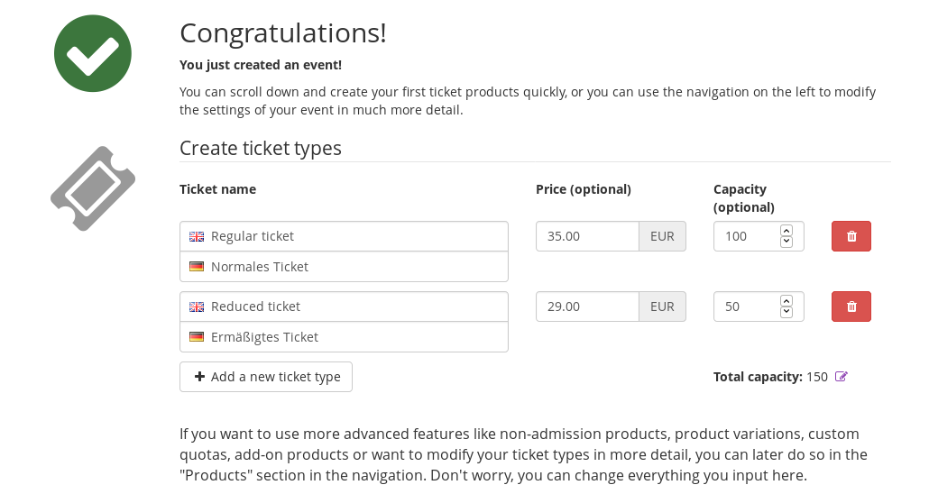 pretix can be hard to use the first time, since it involves understanding many concepts like products and quotas at the same time. The sheer number of settings can be overwhelming as well. To make this easier, we added a quick-start setup that will show up after event creation and allows you to create a simple product structure with quotas right away.