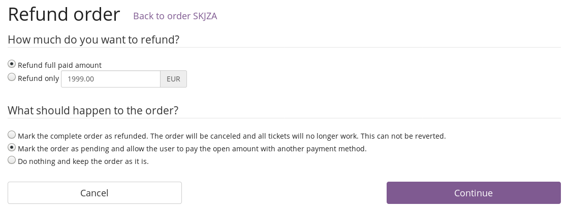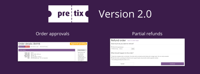 It also allows us to finally deal with partial refunds or payments properly. While it was previously impossible to change a paid order in a way that changes the total price of the order, you can now freely add or remove tickets from an order at any time. If the order total after your change exceeds the paid amount, the customer can start a separate payment to pay the difference.