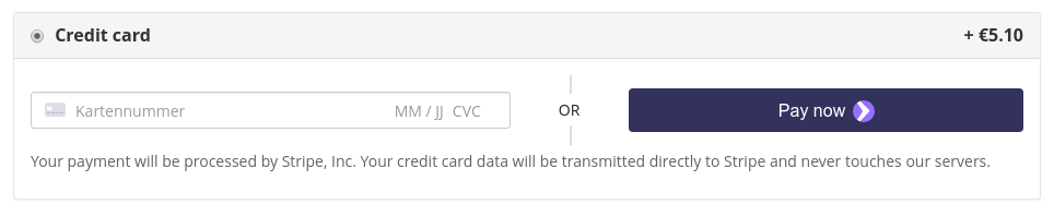 All shops using credit card payment via Stripe now support Apple Pay, Google Pay, Microsoft Pay, and all other payments supporting the payment request standard. This increases conversion, as users do not have to search for their credit card any more, but can simply reuse the payment method stored in their browser.