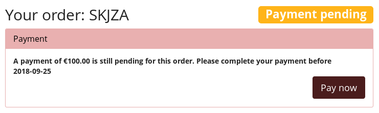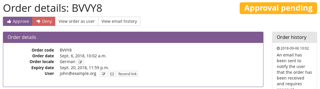 Instead, the event organizer first needs to approve or deny the order request. In either case, an email will be sent to the customer. In case of an approval, the customer will be given a timeframe to complete their payment. In case of a denial, the organizer can enter a reason that will be shown to the user.