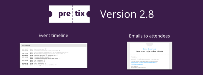 Today, we are releasing the next monthly release of pretix. pretix 2.8 includes a timeline view of your event, direct emails to your attendees and lots of improvements and little features everywhere. Big thanks go out to Andrikopoulos-Giannis, Bostjan Marusic, Chris Spy, GiorgosPap, markiousi, mapostolopoulou, ligi, lislis, ThanosTeste, and Tobias Kunze who contributed to this release. ❤️