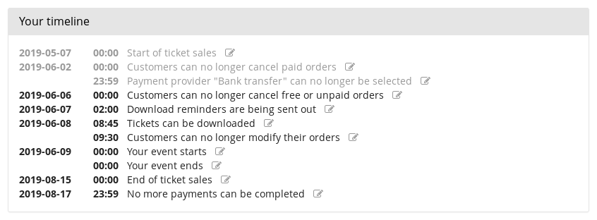 To make things clearer, we're now including a timeline on your event dashboard that shows you in detail everything that will happen to your event until it's over and gives you easy access to all those settings in case you need to change them: