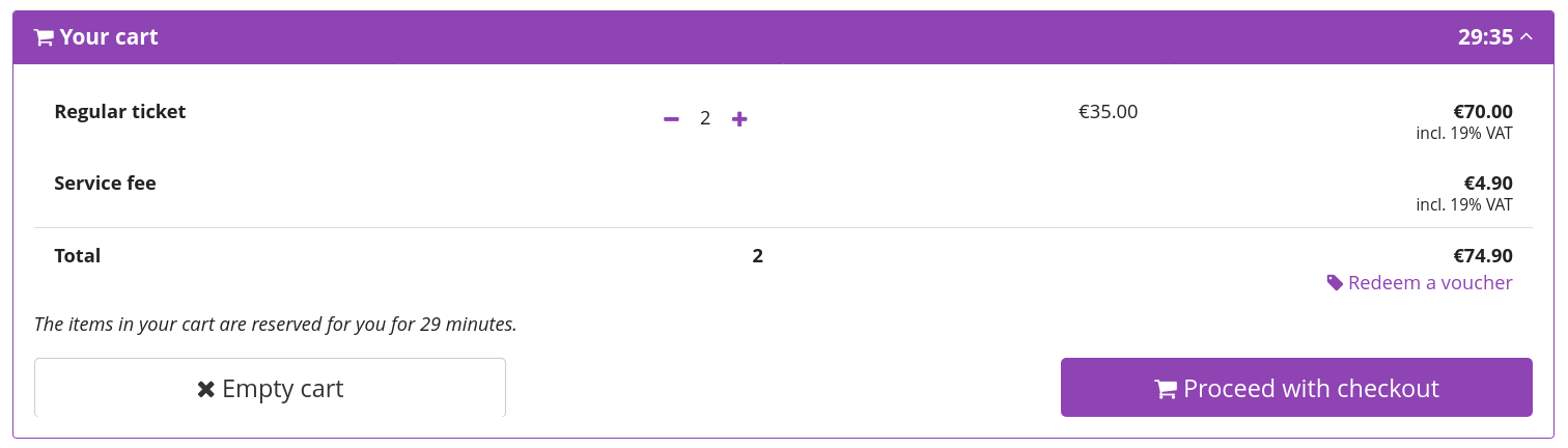 It is now possible to apply a discount voucher to the cart even after the cart has been created. Previously, vouchers needed to be entered before selecting the product. pretix will automatically choose which product(s) in the cart the voucher has the most beneficial effect on and apply it. This of course does not work for vouchers which grant access to hidden products, these still need to be redeemed upfront.