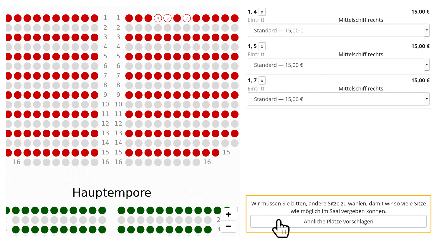 Update May 31st: Additionally, it is now possible to enforce a certain booking order within a row, e.g. to only allow booking starting in the middle of a row or at the aisle. If the user tries to select different seats, they are presented with an error message as well as with a button to switch seats automatically.