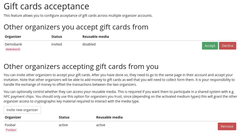 We have now redesigned this feature in a way that makes it easier to use. One organizer can now "invite" a second organizer to accept their gift cards. The invitation can then be accepted or declined by the organizer in the same place.
