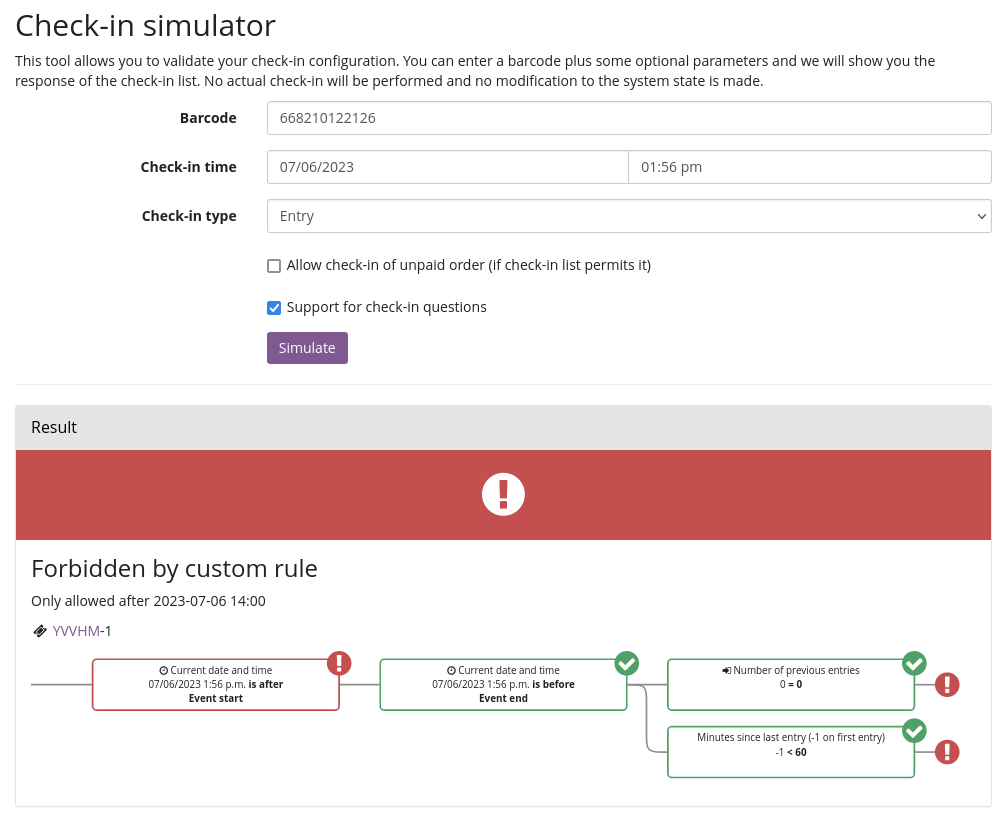 pretix allows to create complex setups in which admission to the event is dependent on a number of conditions that can be freely defined using our check-in rule editor. At the same time, this complexity makes it easy to make mistakes and hard to properly test different edge cases. To help with this, we have added a "check-in simulator" that allows you to test different cases without actually checking in tickets.