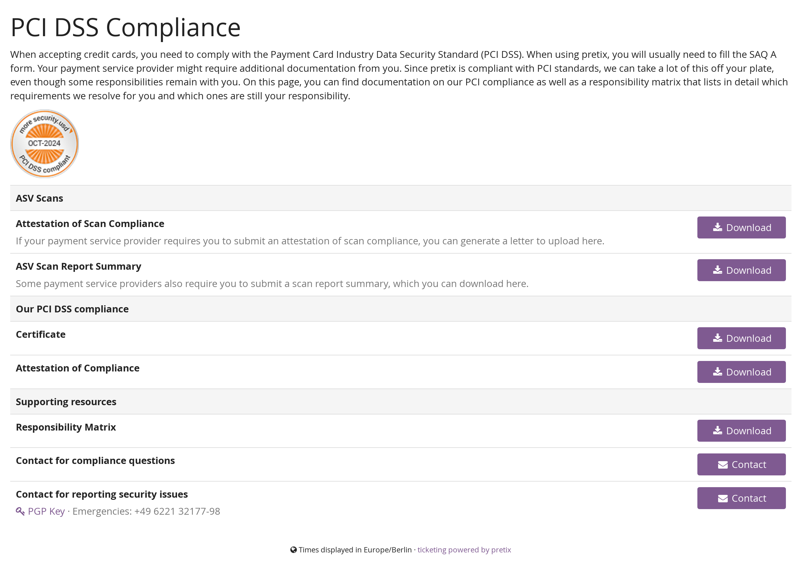 If you have any questions in regards to our PCI DSS certification, would like to know more about information security at pretix in general, or need support with inquiries from your payment service provider regarding PCI DSS issues, just reach out to us by email at pci@pretix.eu or by phone.