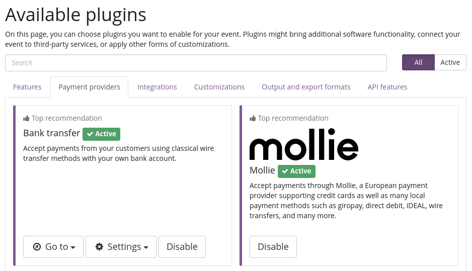 Lots of our features are delivered via plugins that supply additional payment providers, export formats, or entirely new areas of functionality. As the list of plugins grows, it becomes harder to find the one you are looking for. In this release, we have improved the plugin page by adding a search bar at the top that brings you quickly to your desired plugin.