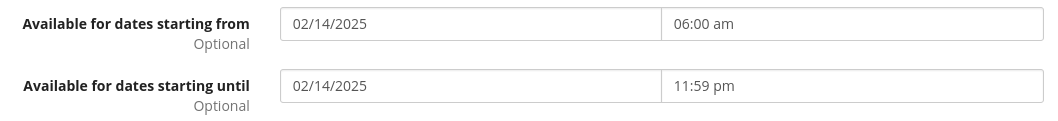 When creating automatic discounts within an event series, you can now specify a range of event dates on which the discount is applicable. This allows you to create discounts for special occasions and festivities, such as a 2-for-1 discount for valentines day, a Christmas special, etc.