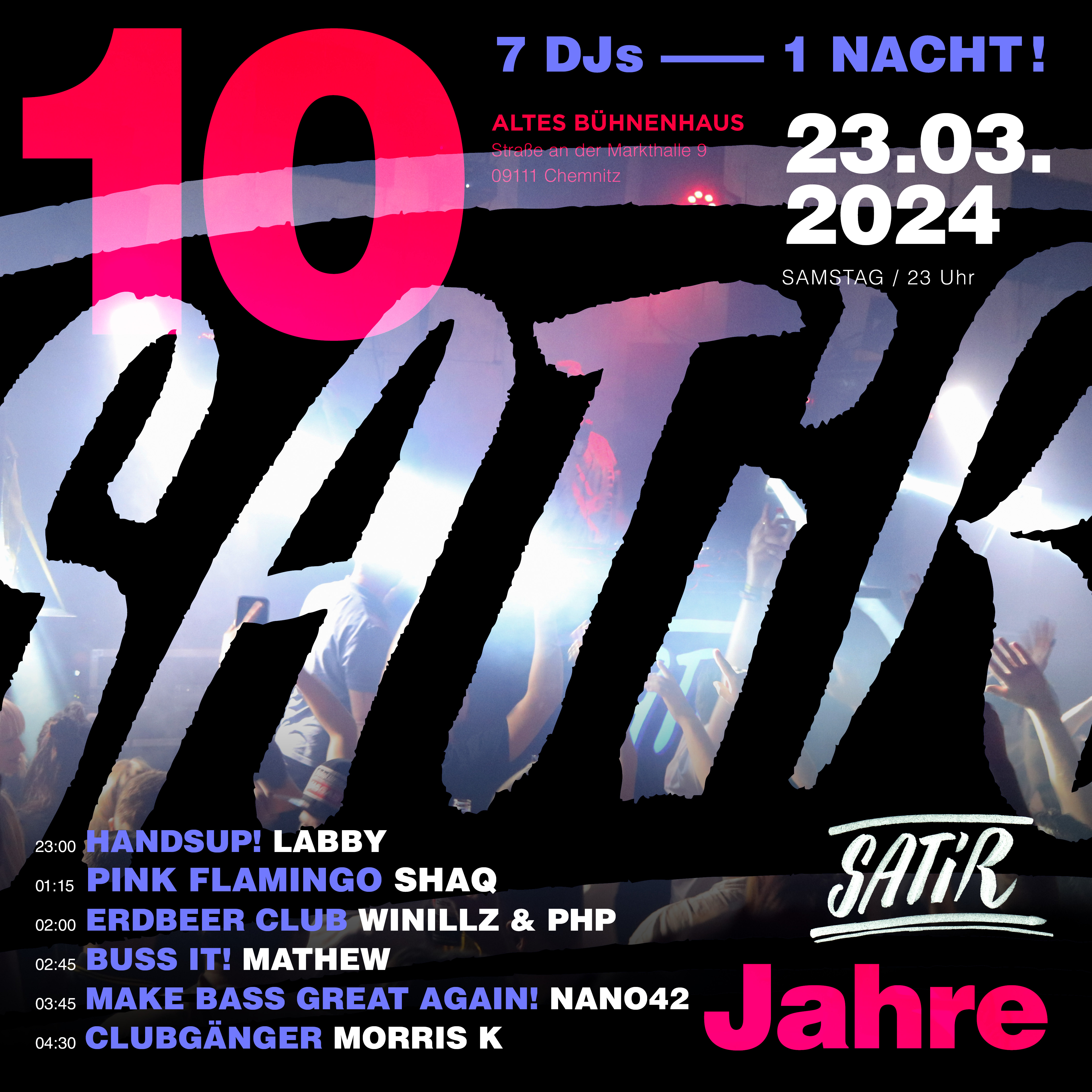 wie feiert man am besten einen runden Geburtstag? Wir laden unsere besten Freunde ein. Dazu gehören: HandsUp, PinkFlamingo, ErdbeerClub, BussIt!, MakeBassGreatAgain und Clubgänger. Dazu kommen noch die Satir Staff Crew, die Satir DJ Crew und last but not least die beste Partycrowd der Stadt. Zusammen feiern wir eine Nacht lang unsere besten sechs satir Klassiker, also nacheinander sechs Partys in einer Nacht! Das wird einfach zu wild!