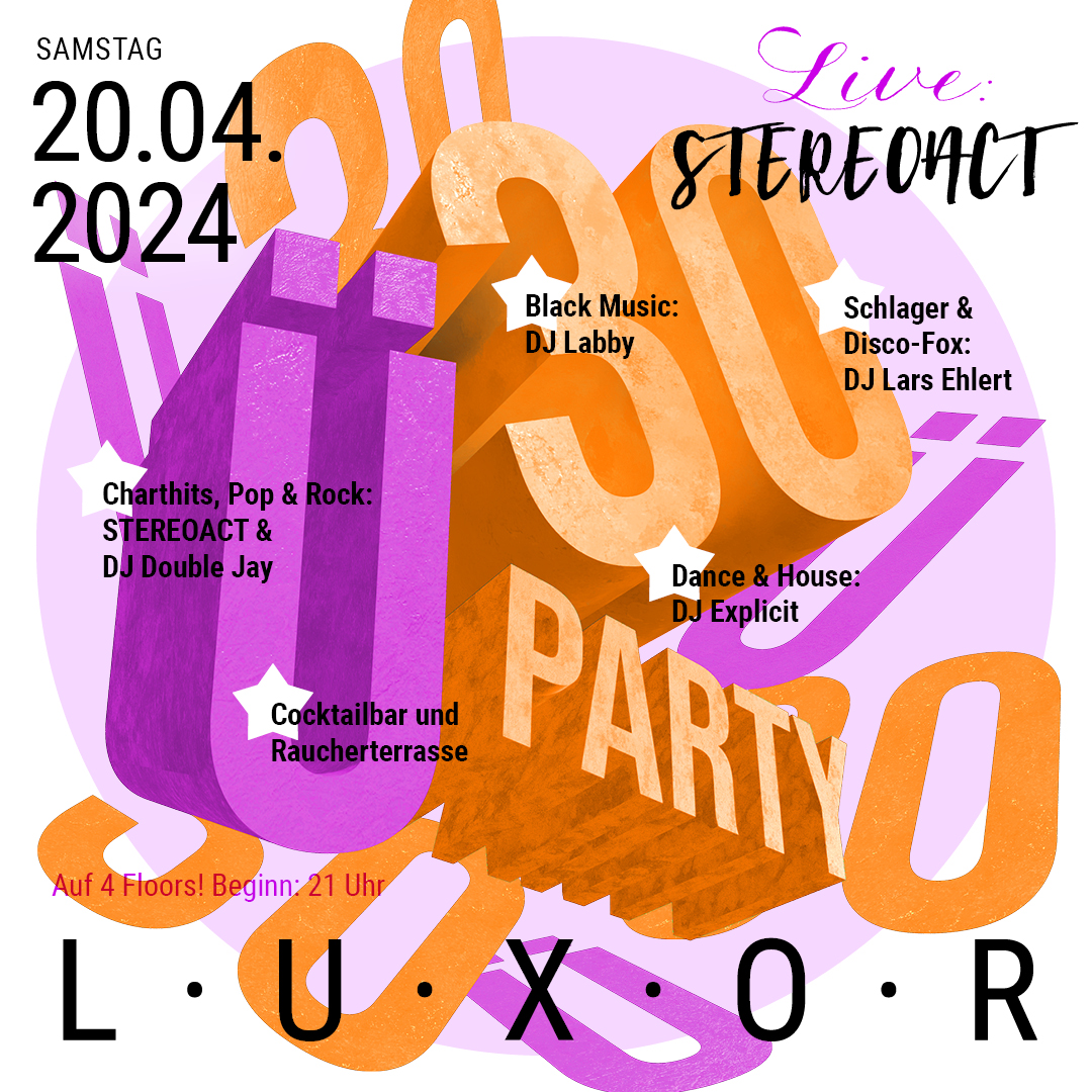 Großes Kino im Luxor! Nach dem Debüt im letzten Frühjahr begrüßen wir wieder alte Bekannte aus der Zeit des legendären FORUMS. Seit langem schon ist DJ Ric mit seinem Berufskollegen, DJ Rixx, als Stereoact in ganz Europa unterwegs. Mit über 250 Millionen Streams ihrer deutschsprachigen Songs zählen sie zu den erfolgreichsten deutschen DJs. Dazu kommen Auszeichnungen wie 8-fach Gold, 4-fach Platin und der seltene Diamant Award für über 1,2 Mio verkaufte Singles mit ihrem Mega-Hit „Die Immer lacht ” (mit Kerstin Ott) sowie drei Echo Nominierungen. Und jetz nominieren wir Dich, teil dieser grandiosen Nacht im Luxor zu werden. Mit dabei ist außerdem DJ Ron für die abteilung Hip Hop, DJ labby für die straffen electro Beats und last but not least DJ Bonzay für die Schlager Area. Das LineUp ist richtig fett, bestell Dir Deine Tickets besser gestern als morgen, let's go!