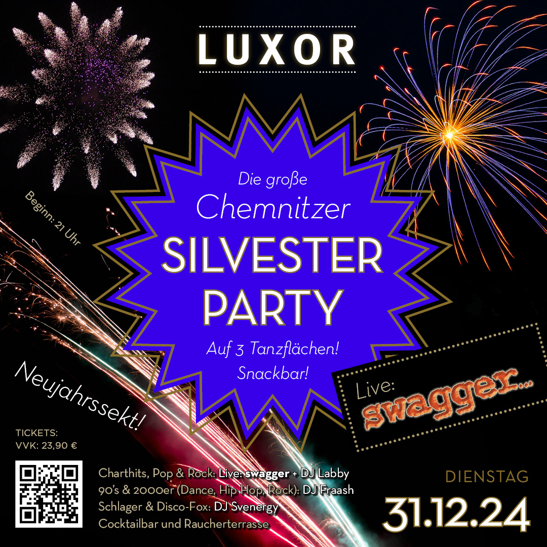 So, wie es sein soll, kommt bei uns das Beste zum Schluss. Die letzten Stunden des Jahres feiern wir gemeinsam mit allen Freunden im Luxor. Und weil uns das noch nicht genug ist, starten wir das neue Jahr mit den besten Vorsätzen, den besten Drinks und natürlich mit den besten Sounds. Keine Zauberer, keine Buffets, dafür drei Tanzflächen und Bühnen, leckere Drinks an allen Bars, einen Neujahrssekt aufs Haus und ausgelassene Stimmung pur ab 21 Uhr.. Prosit!
