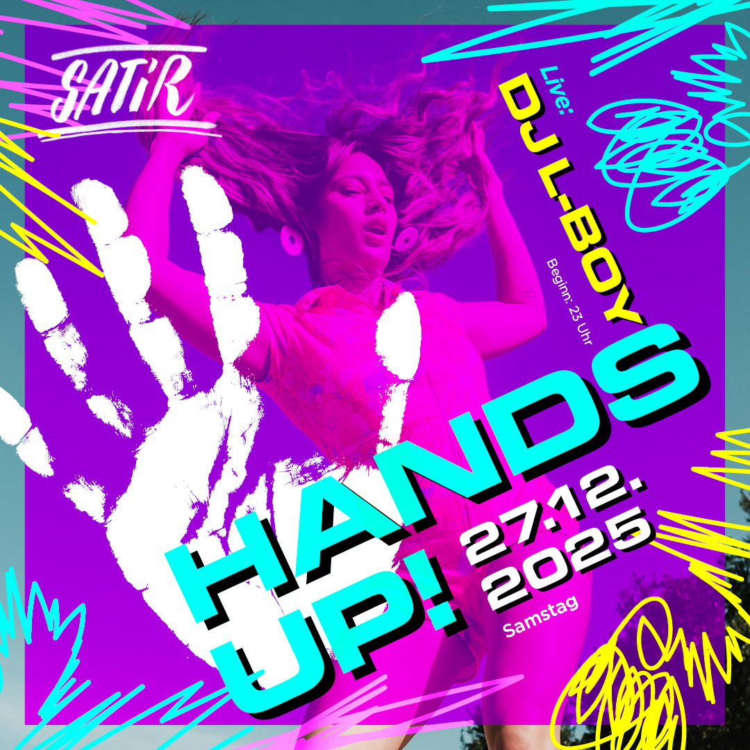 hurray ya, wir zünden die letzte Stufe auf unserer Zeitreise durch den Partyhimmel - back to the ninetees, two thousands und all time bangers. Feiert mit uns den ultimativen letzten Samstag des Jahres! DJ L-Boy sich zur Mission gemacht, unter dem Motto "Hands Up" Eure Arme im Satir senkrecht anzuordnen. Anschnallen, das wird übertrieben wild! xo\satir