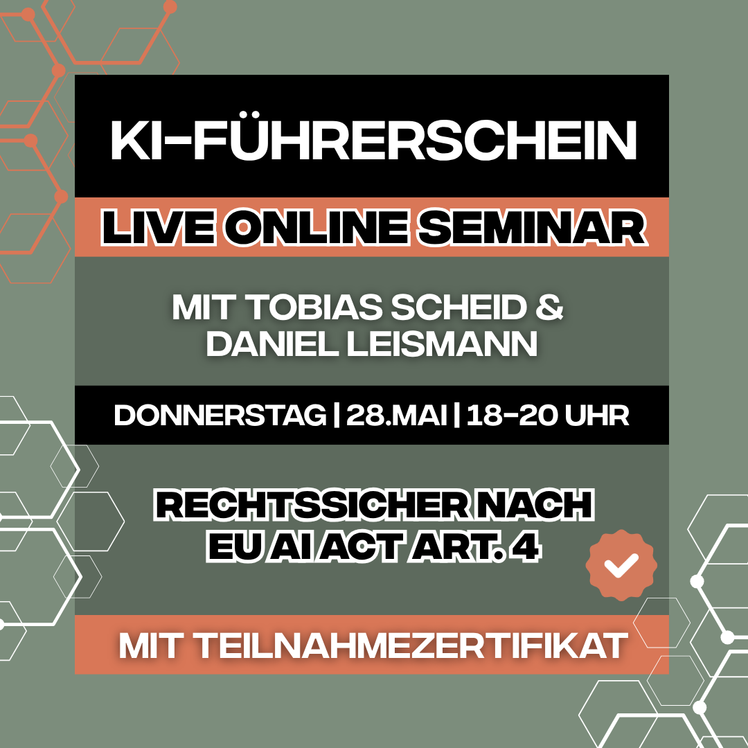 Die gute Nachricht: Du musst dafür weder Jurist noch Informatiker werden. In diesem kompakten Online-Seminar bekommst du in 2 Stunden alles, was du wissen musst, um KI rechtssicher, verantwortungsvoll und produktiv einzusetzen.