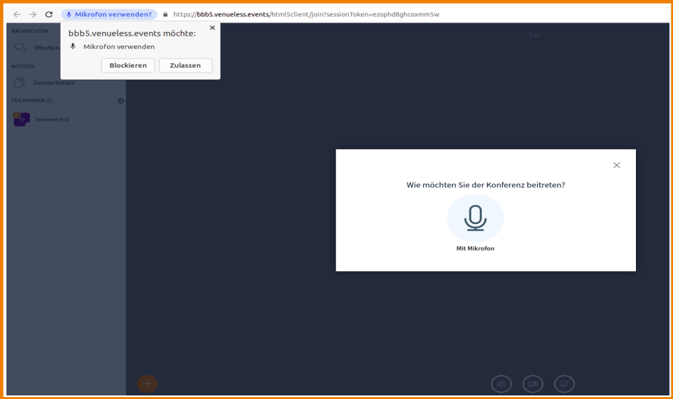 Beim Videocall muss im Browser noch die Berechtigung gegeben werden, dass sich ein neues Browserfenster öffnet, sowie Kamera und Mikro sollten zugelassen werden.